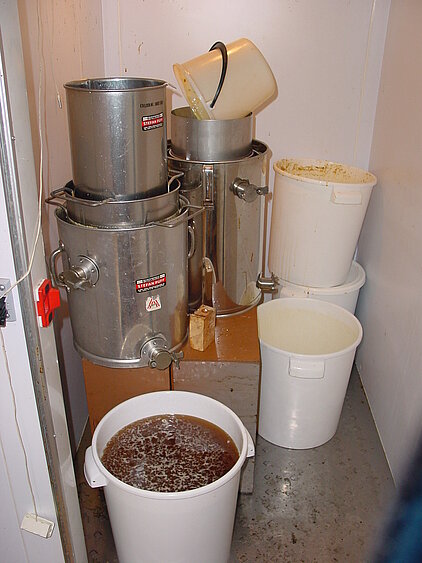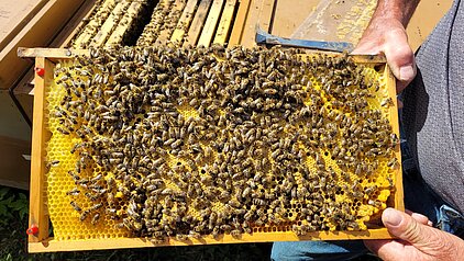 Ende Juli, wenn die Haupttracht vorbei ist und der Honig die volle Reife hat, nehmen wir einen Großteil des Honigs heraus und ergänzen den Raub mit Futtersirup.